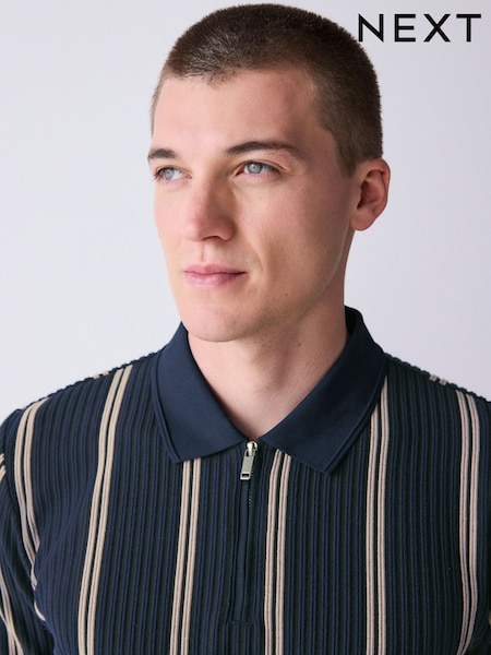 Navy Blue/Stone Vertical Stripe Quarter Zip Polo Shirt