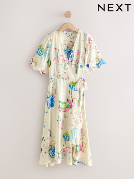 Ecru White Floral Printed - Scallop Sleeve Wrap Midi Dress