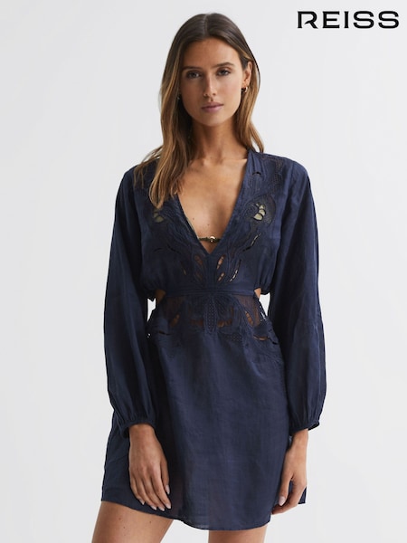 Reiss Navy Lelani Ramie Plunge Neck Kaftan