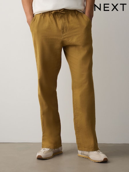 Yellow Regular Tapered Fit Linen Rich Blend Textured Trousers With Elasticated Waist