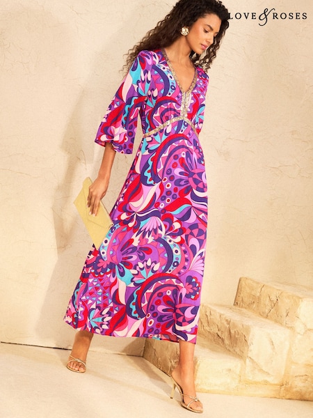 Love & Roses Pink Abstract Sequin Trim V-Neck Midi Dress