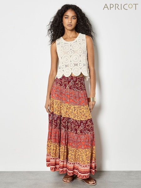 Orange - Apricot Patchwork Print Tiered Maxi Skirt