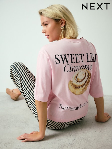 Pink Cinnamon Roll Graphic Relaxed Boxy Elbow Length Crew Neck T-Shirt