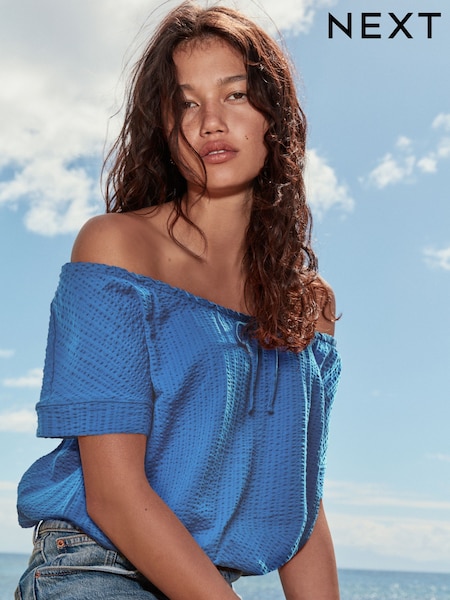 أزرق - تيشِرت بكُم قصير بياقة مفتوحة مع حاشية فقاعية