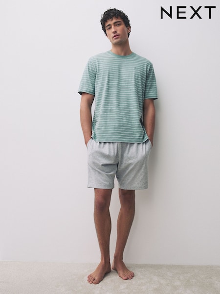 أخضر - طقم بيجامات جيرسيه مخطط بأكمام قصيرة