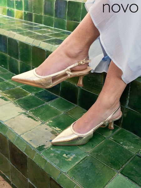 ذهبي - حذاء بكعب صغير وحزام خلفي منخفض ومقدمة مدببة