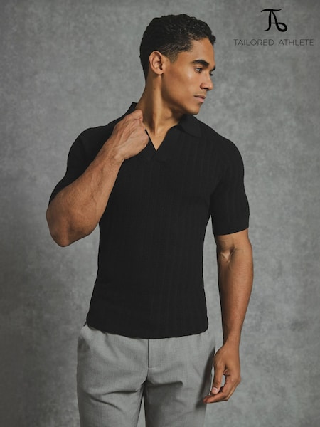 Tailored Athlete Black Muscle Fit Vertical Stripe Knitted Open Collar Polo Shirt