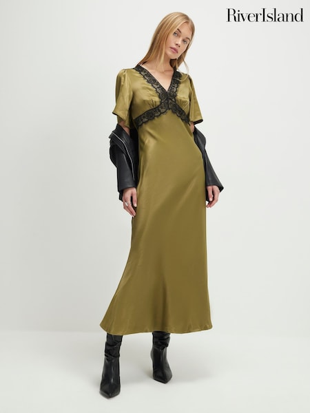 River Island Green Short Sleeve V-Neck Lace Slip Maxi Dress