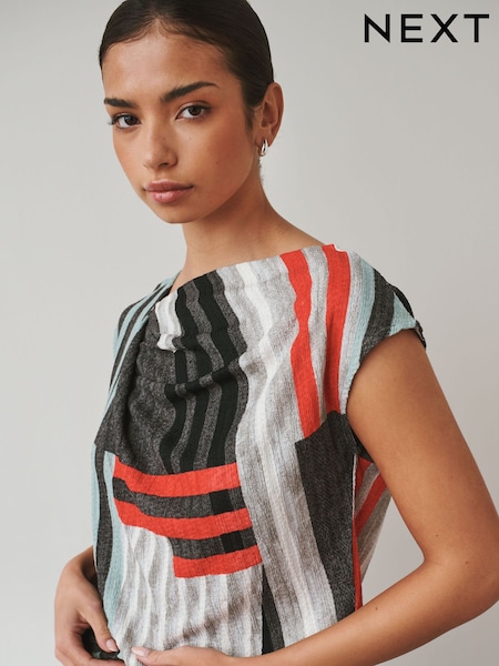 Grey Stripe Print Asymmetric Pleated Drape Short Sleeve Top