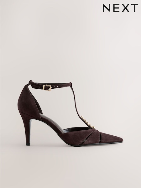 Chocolate Brown Leather Forever Comfort® Leather Two Part T Bar Embellished Heels