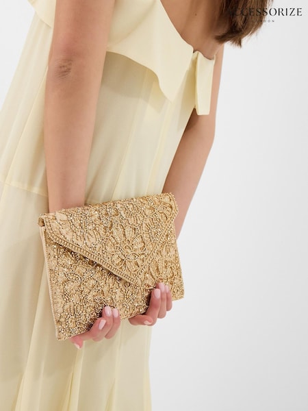 Accessorize Gold Floral Embellished Envelope Clutch Bag