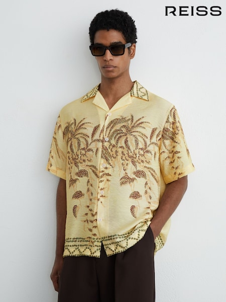 Reiss Yellow Camino Palm-Print Cuban-Collar Shirt