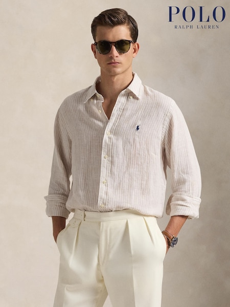 Polo Ralph Lauren Coastal Beige & White Custom Fit Linen Stripe Shirt