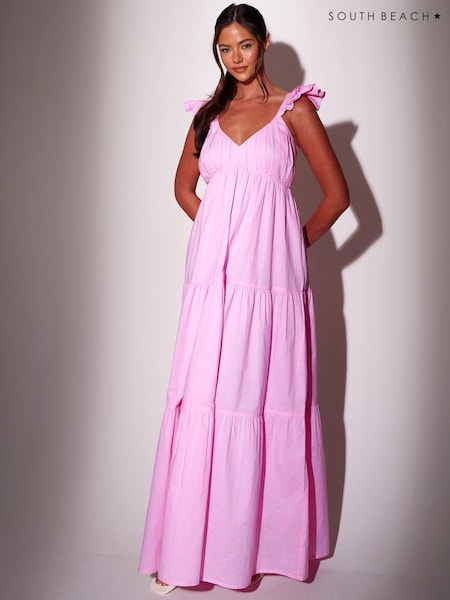 South Beach Pink 100% Cotton Frill Sleeve Tiered Maxi Dress