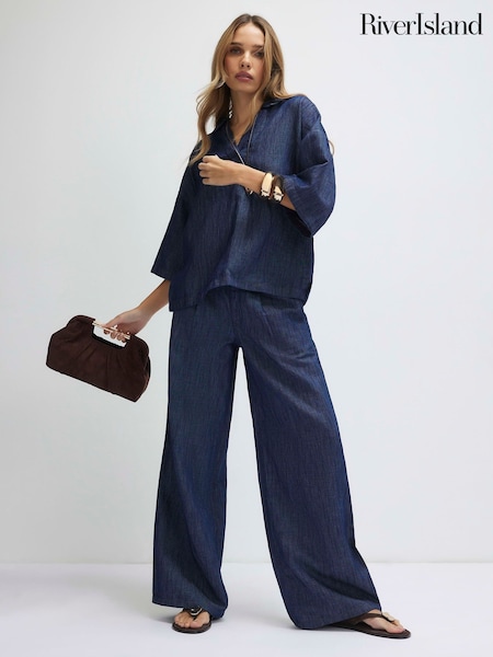 River Island Blue Petite Linen Blend Wide Leg Trousers