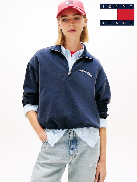 Bleu - Tommy Jeans Logo Embroidery Relaxed Quarter-Zip Sweatshirt