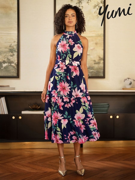Blau - Yumi Floral Halter Neck Midi Dress With Matching Belt