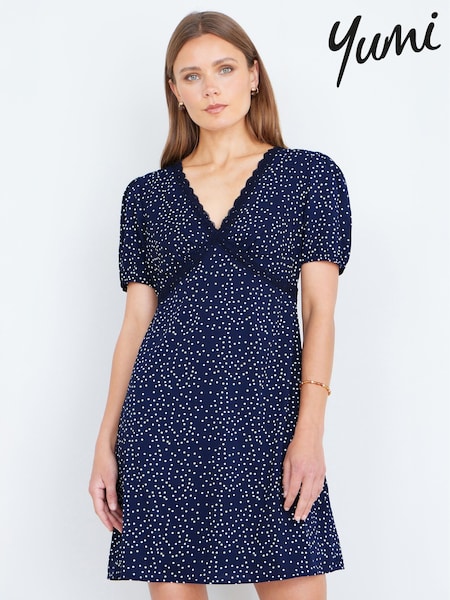 Yumi Blue Spot Print Lace Trim Skater Dress