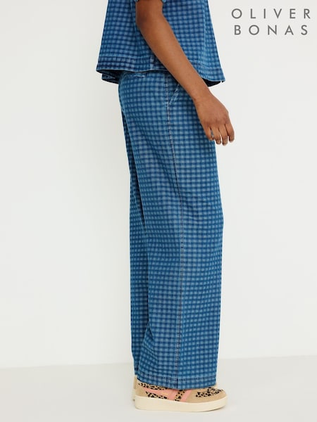 Oliver Bonas Blue Denim Gingham Wide Leg Jeans