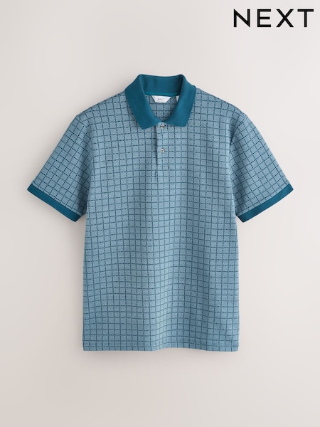 Grey Button Neck Regular Fit Long Sleeve Knitted Check Polo Shirt