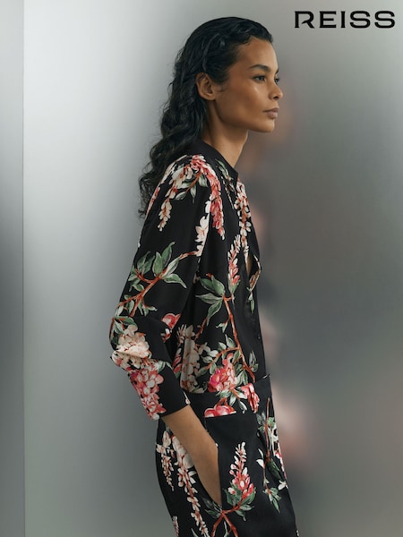 Atelier Silk-Chiffon Floral-Print Black Shirt