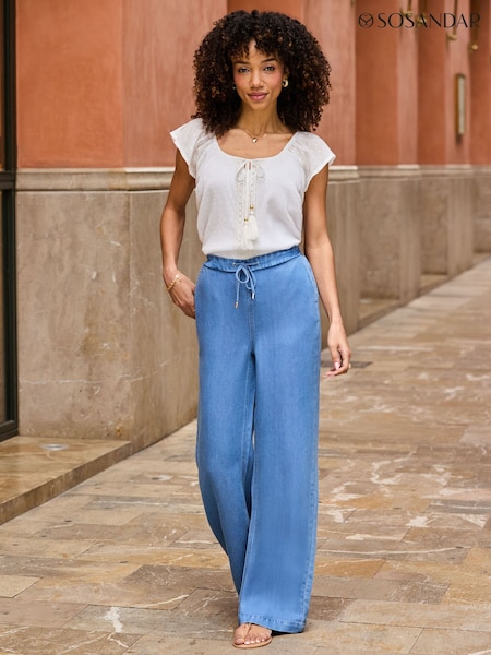 Sosandar Soft Denim Drawstring Waist Wide Leg Trousers