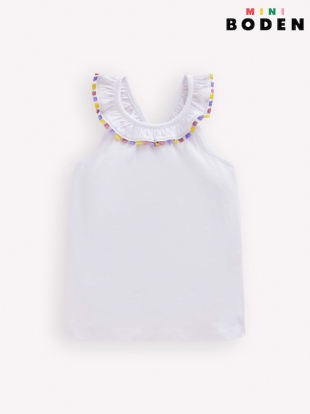 Boden White Cross-Back Pom Trim Top