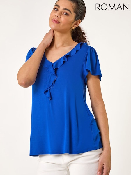 Roman Blue Ruffle Front Stretch Top