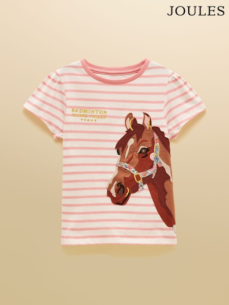 Joules Official Badminton Pink & Cream Stripe Horse Applique T-shirt