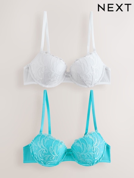 Aqua Blue/White Push Up Pad Balcony Padded Embroidered Bras 2 Pack
