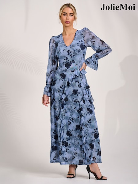 Jolie Moi Long Sleeve Ruffle Mesh Maxi Dress