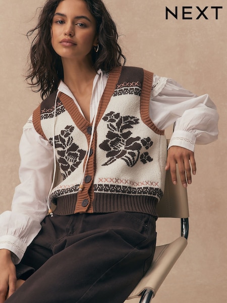 Brun/hvid - Bomuldsrig blomster strikket vest med knapper