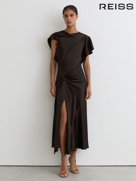 بني - فستان ستان متوسط الطول بتفصيل درابيه Sasha من Reiss