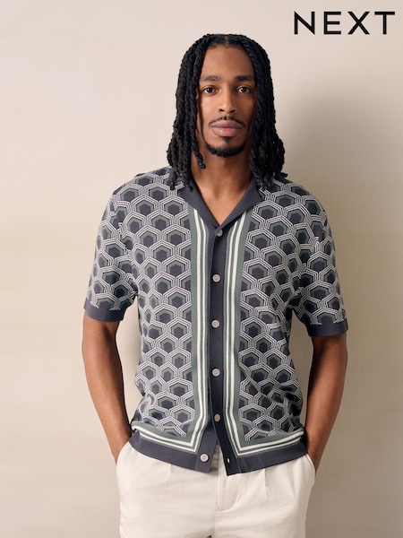 Grey Geometric Pattern Knitted Cuban Shirt