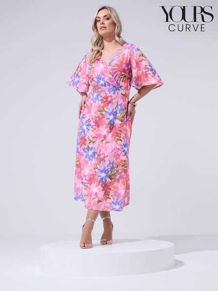 Yours Curve Pink London Floral Linen Look Wrap Dress