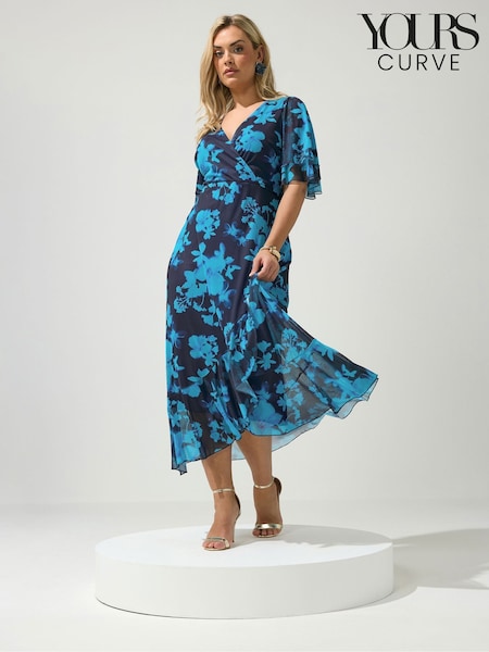 Yours Curve Blue London Mesh Wrap Ruffle Dress