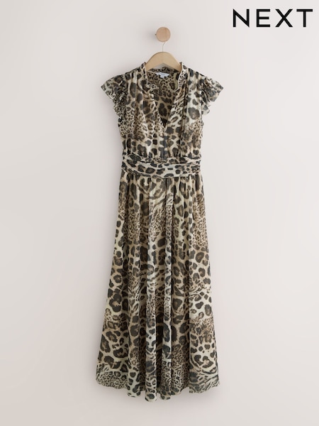 Brown Animal Print Pleated Mesh Print V-Neck Occasion Maxi Dress