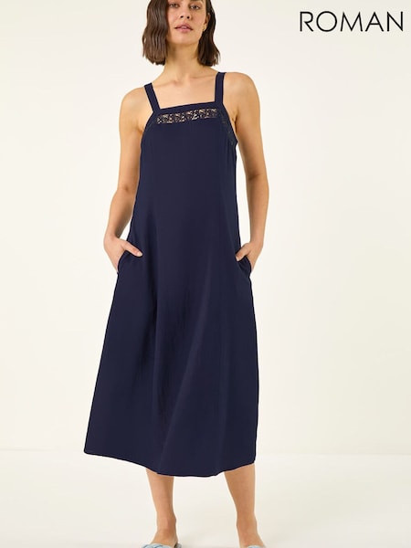 Roman Blue Linen Blend Lace Trim Midi Dress