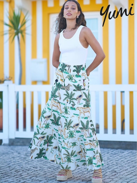 Yumi White Animal Print Cotton Tiered Maxi Skirt
