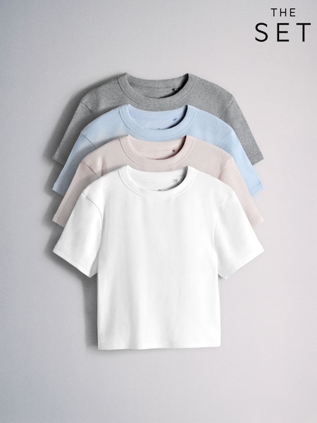 The Set 4 Pack Ribbed Cropped Fitted T-Shirts Charcoal/Blue/Pink/White