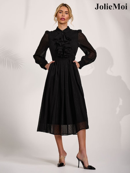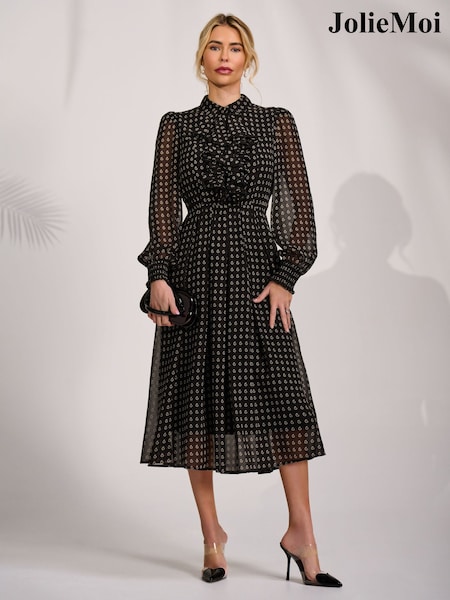 黑色 - Jolie Moi Textured Chiffon Long Sleeve Shirt Dress