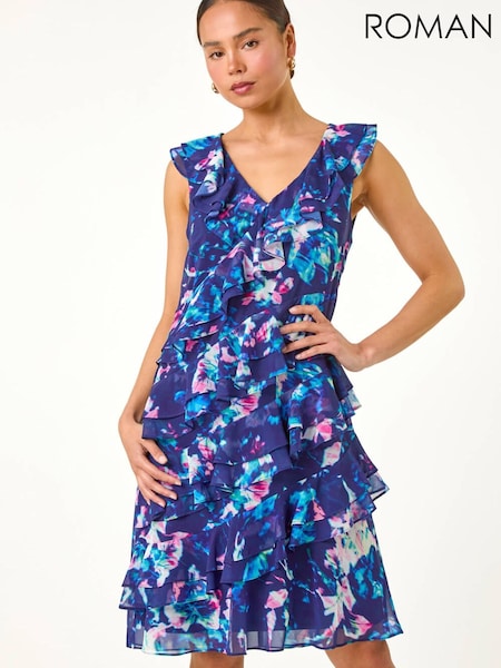 Roman 嬌小系列抽象印花荷葉邊直筒連身裙