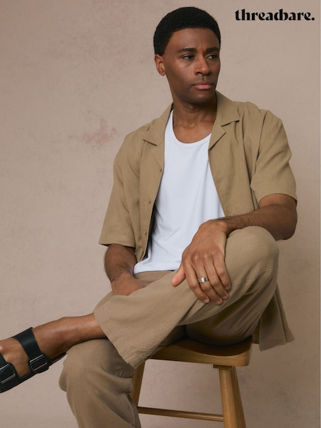 大地色 - Threadbare Relaxed Fit Linen Blend Short Sleeve Shirt