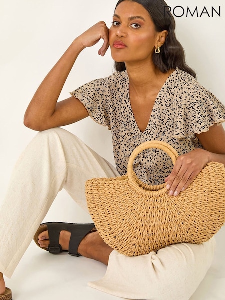 Roman Print Ruched Frill Sleeve Top