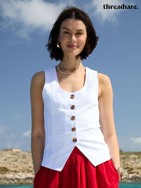 白色 - Threadbare Scoop Neck Longline Linen Blend Waistcoat