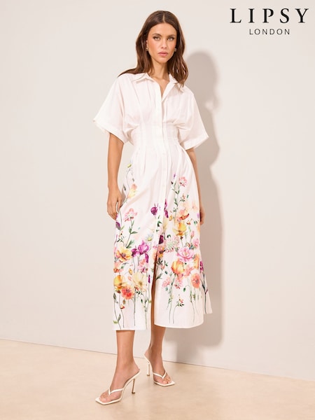 Lipsy White Floral Cinched Waist Midi Shirt Dress