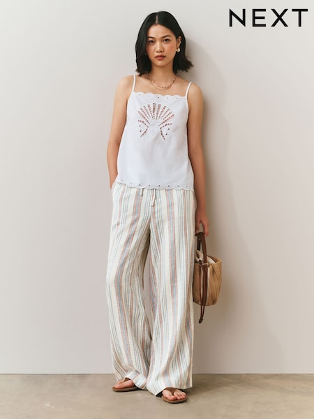 米色/藍色/紅色條紋 - 亞麻混紡寬褲管褲裝