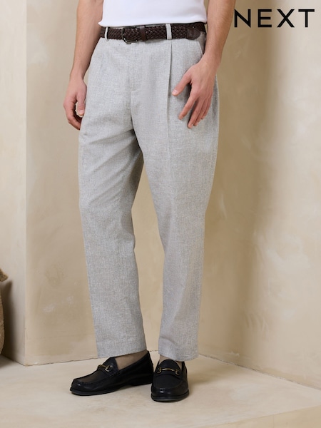 淡灰色紋理 - 常規剪裁型格亞麻棉混紡附腰帶長褲