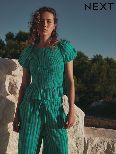 綠色條紋 - 泡泡袖上衣