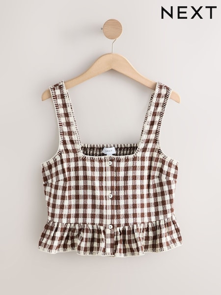 朱古力棕色格子棉布 - Lobster Print Peplum Square Neck Top